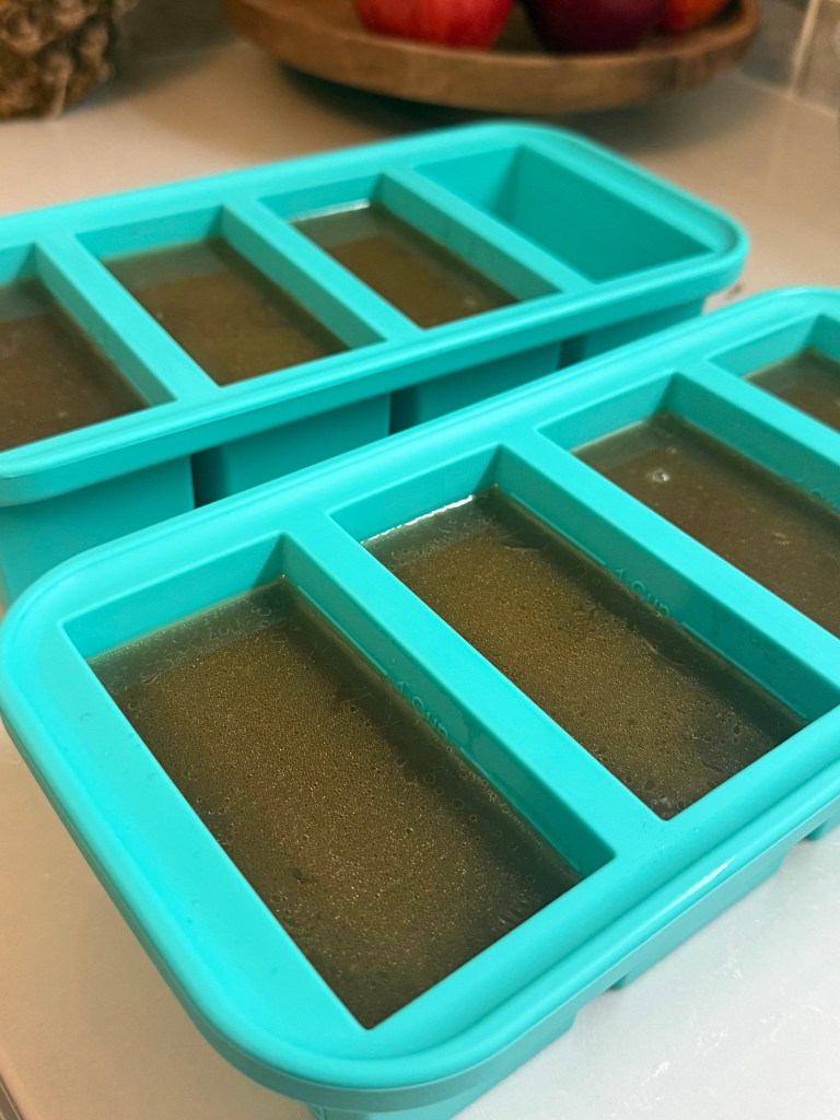 - Let cool, then store in jars or freezer-safe containers (I use these 1 cup Souper Cubes that make freezing the stock easy and even easier to use while cooking).